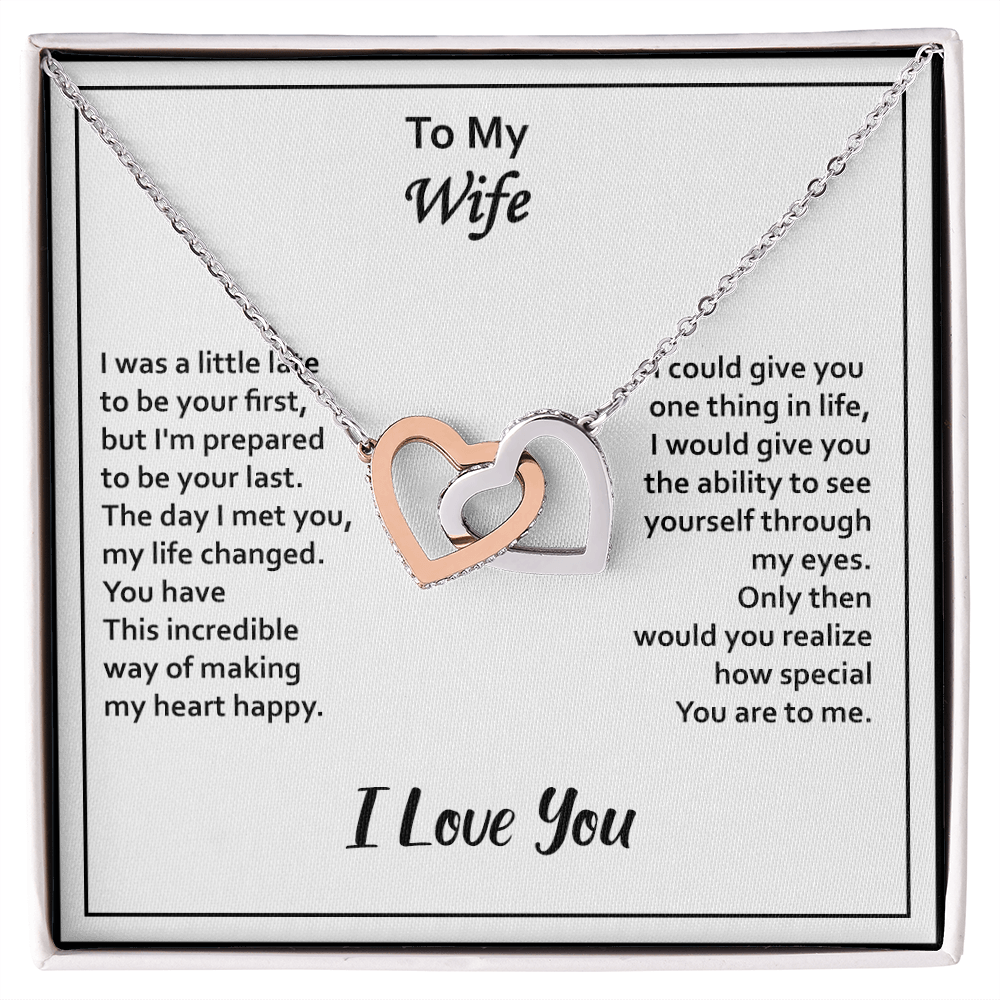 To My Wife – Interlocking Hearts Necklace - I May Be Late to Be Your First, But I'll Be Your Last – Heartfelt Message Card Gift from Husband – Perfect for Anniversary